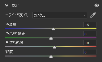 - 今回はこのように調整しました。この“色温度”という箇所を黄色い方に引っ張ると、写真全体が暖色っぽくなります。食品の鮮やかな色彩も少し引き立たせたいので、“自然な彩度”も少し上げています。