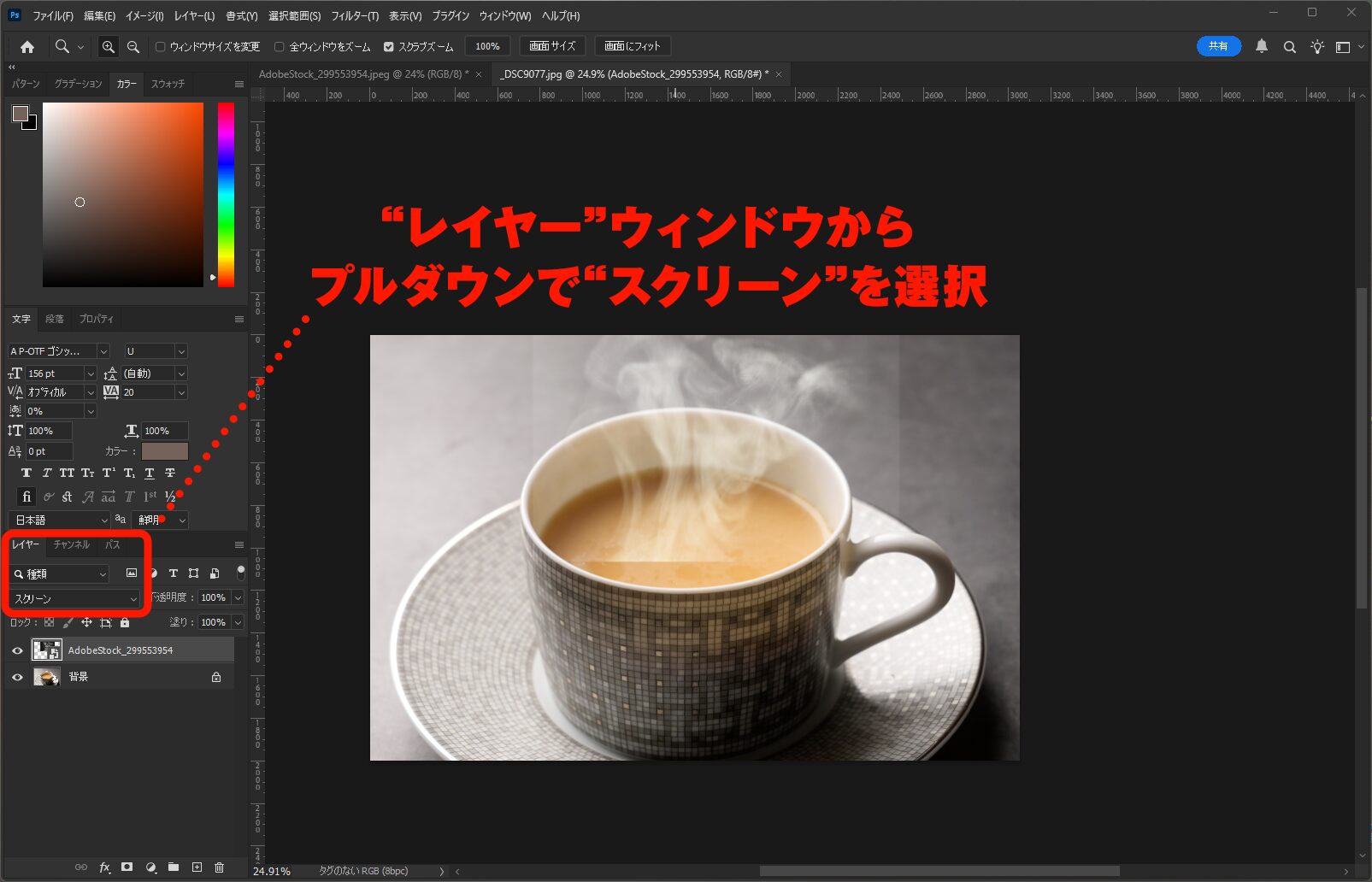 ↓ 背景が黒い湯気画像でも、レイヤースタイル「スクリーン」で載せると白い湯気だけが浮き上がります。