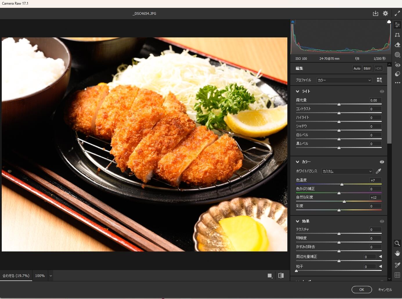 - 食品の画像を用意し、Camera Raw フィルター(Ctrl+Shift+A)を開きます。